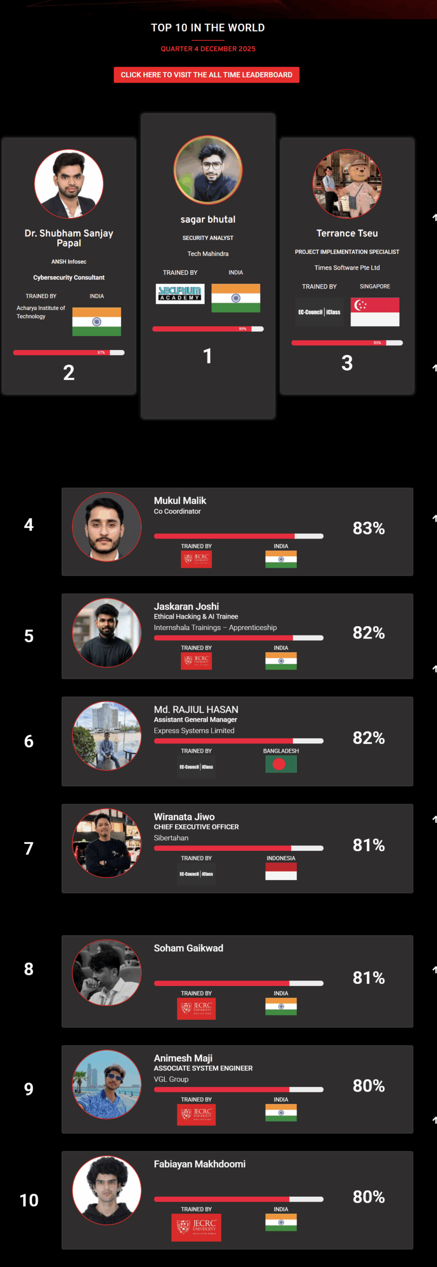 Being featured on the Global Ethical Hacking leaderboard is a privilege. Members receive wide coverage and cognizance from the cybersecurity community. You have now set the bar and it just got higher!